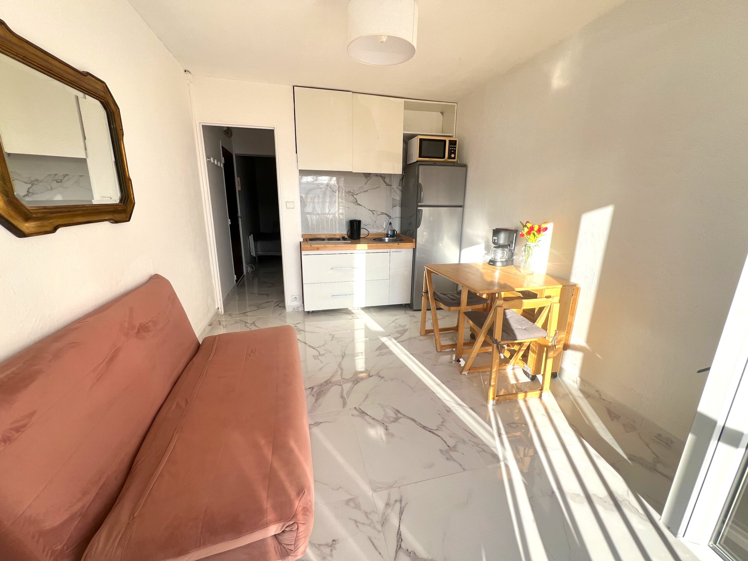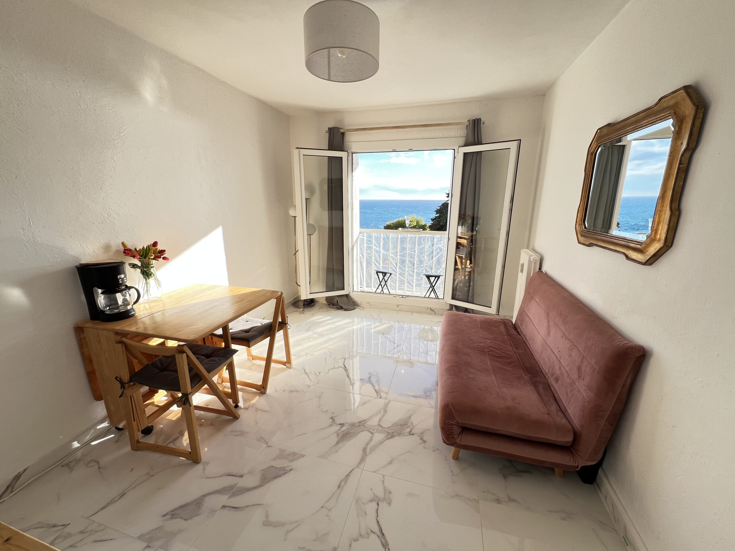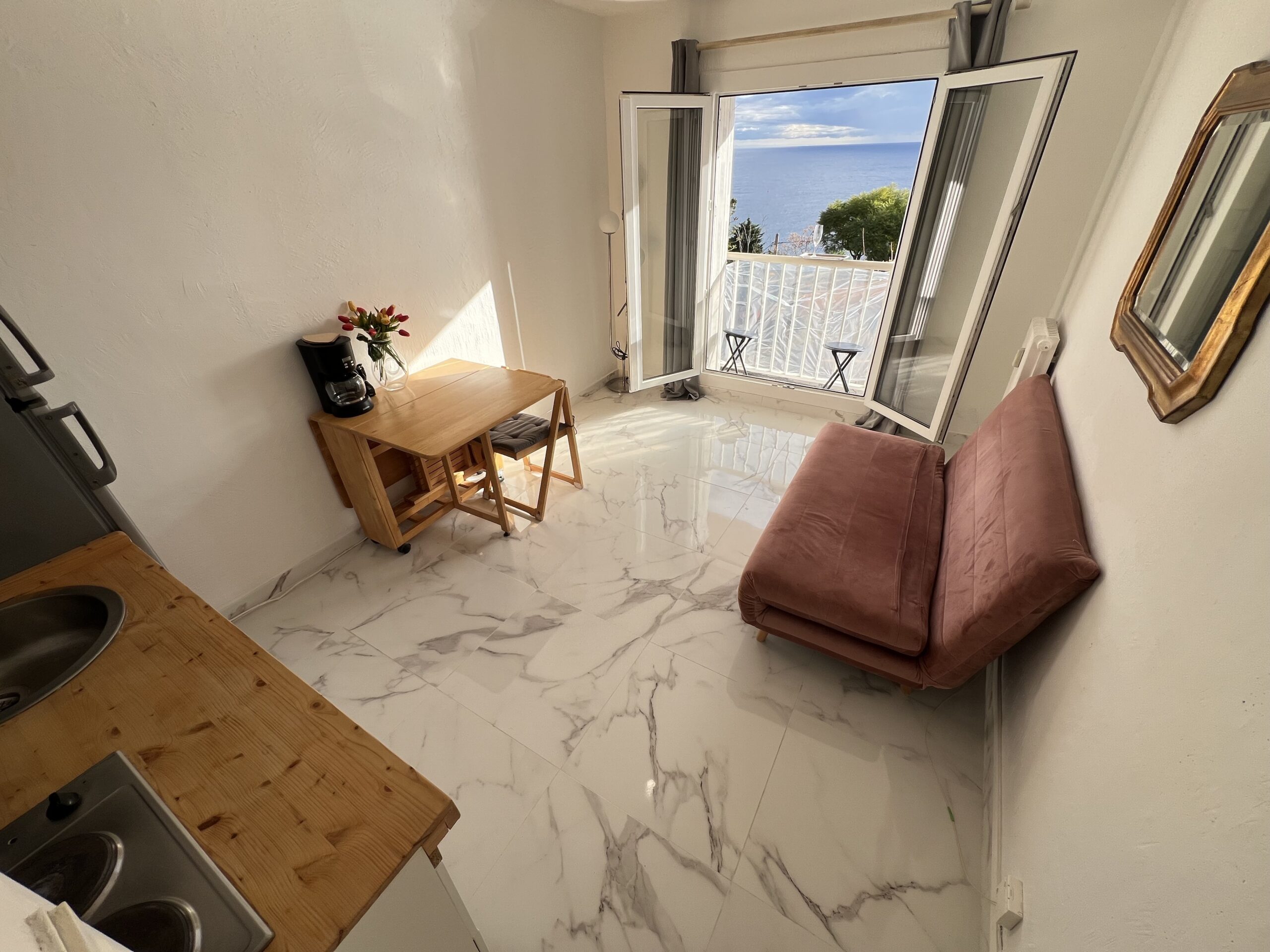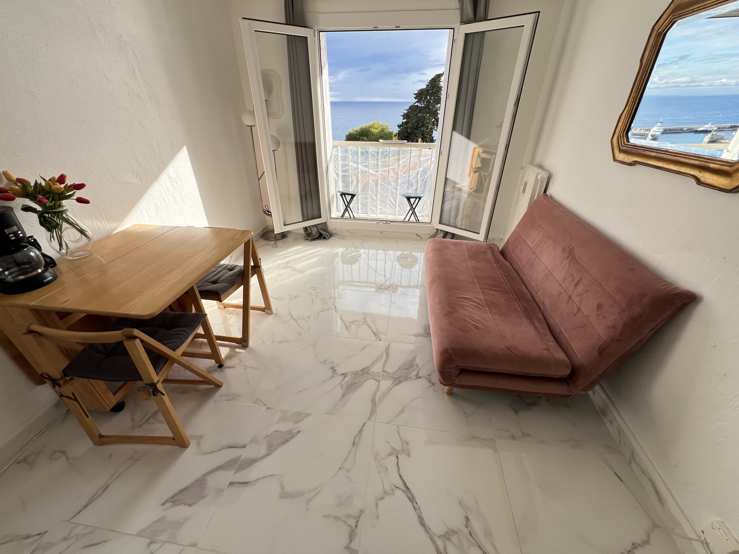 Vue mer et Monaco de salon et balconnet. Calme. A pieds de Monaco(5min.a pieds),plages Marquet (5 min. à pieds),commerces, port de Cap d’ail, bus 100 devant immeuble , train à 5 m, Tennis à 3 min. C’est une 2 pièce de 26 m ²+ petit balcon. Salon, cuisine ouverte équipée, une chambre indépendante avec 2 lits simples/ petite fenêtre , rangements .salle de douche . Plein centre ville. Machine à laver, machine à café, réfrigérateur, micro-ondes, double vitrage.