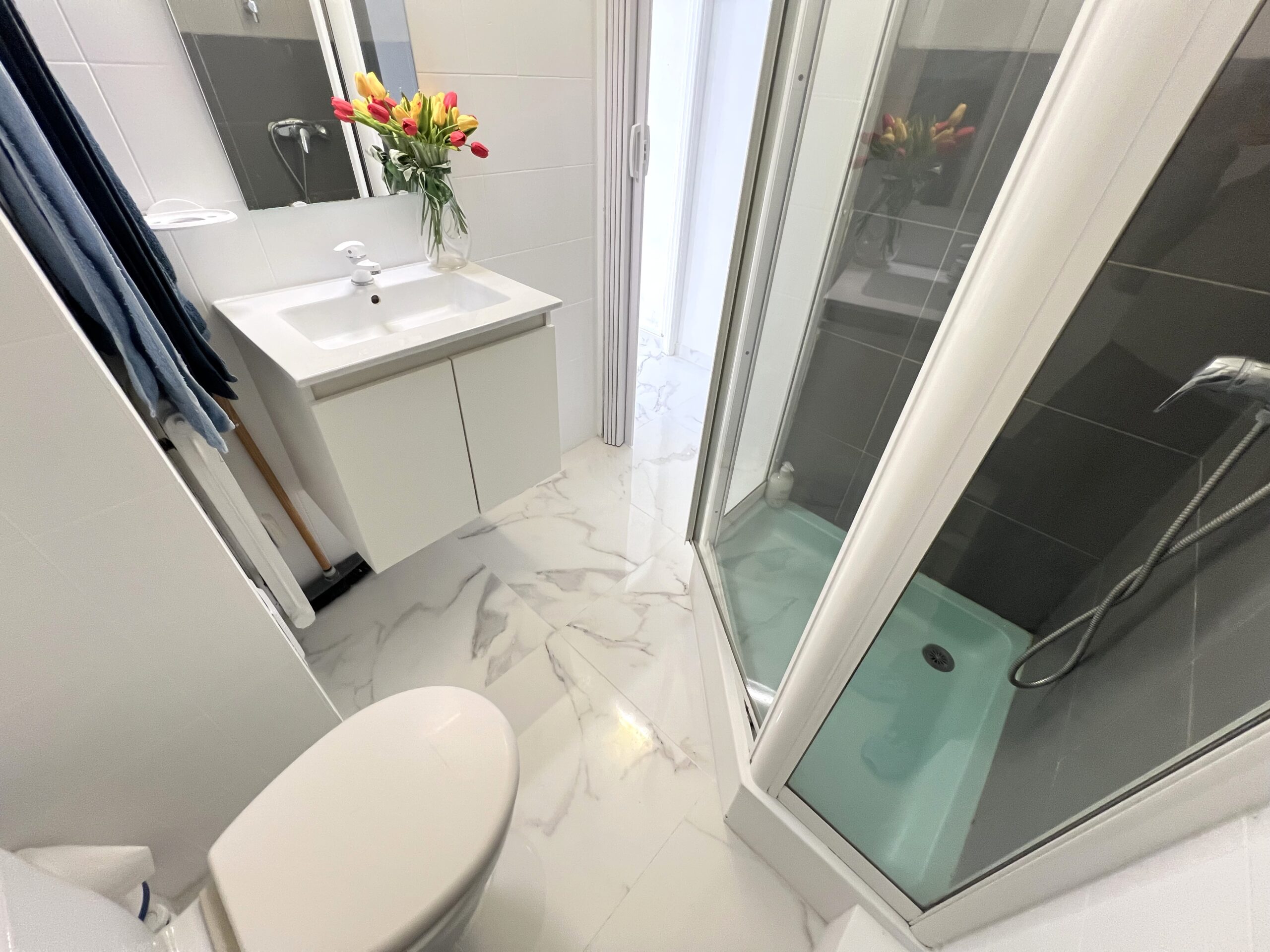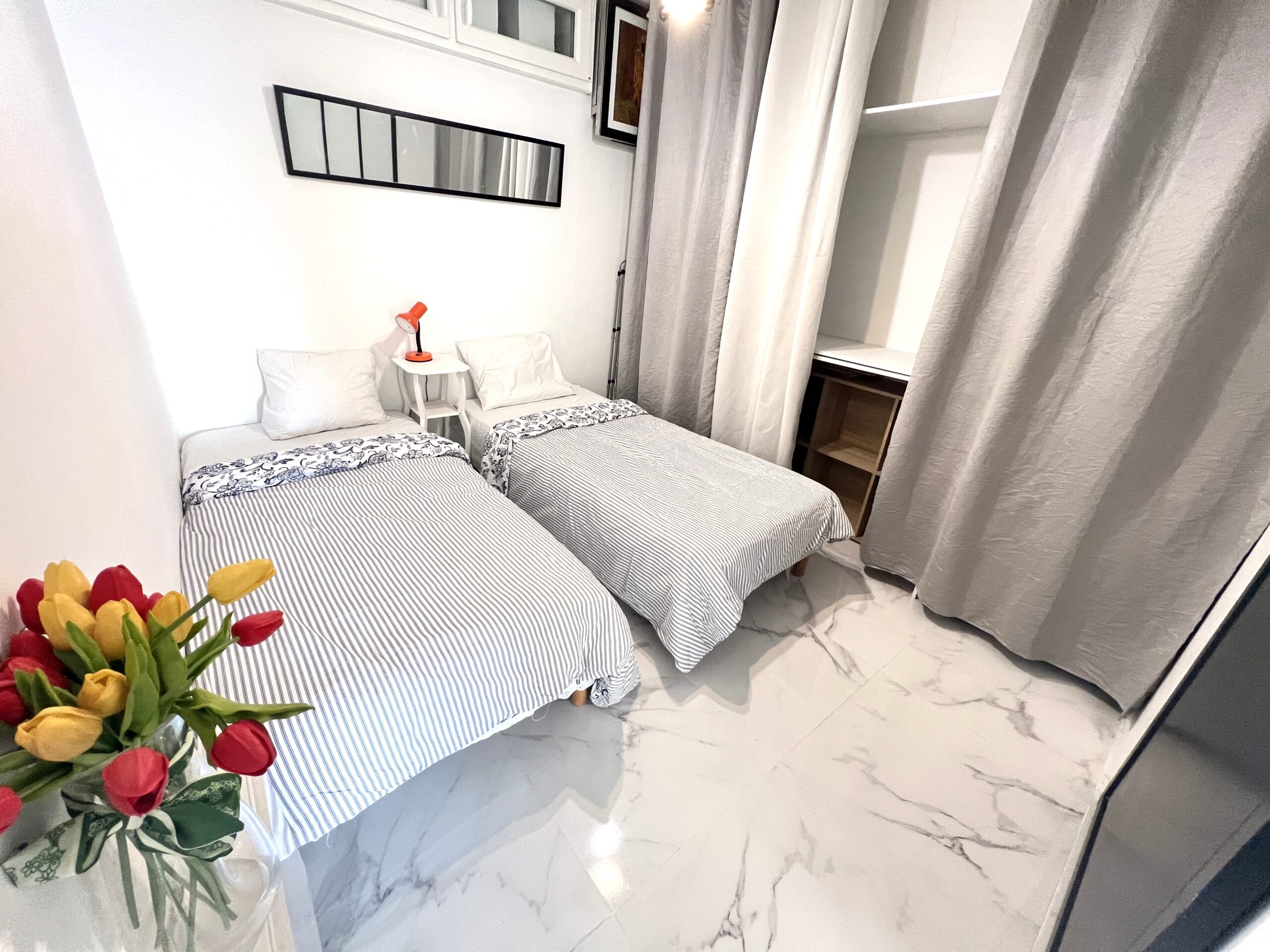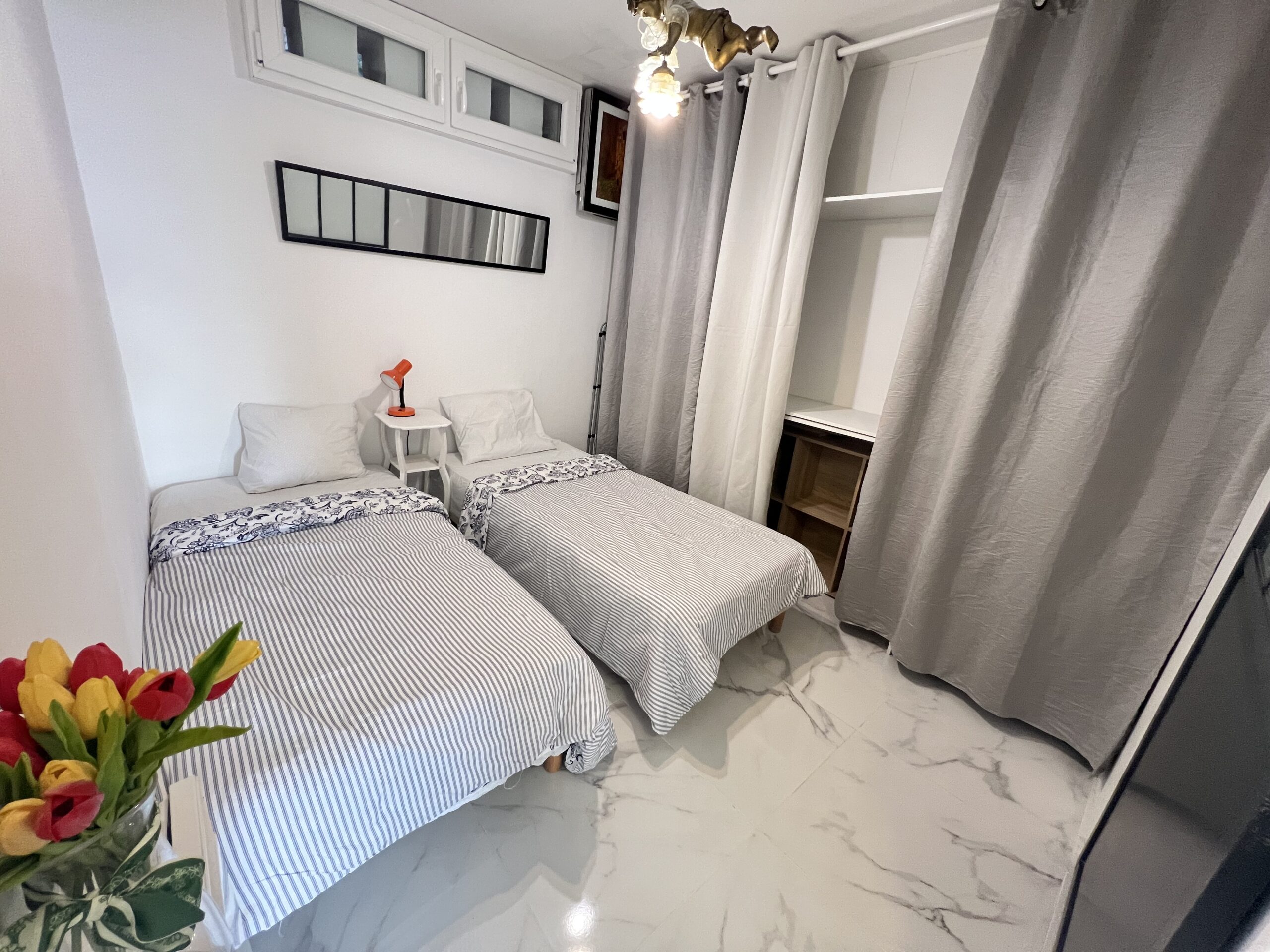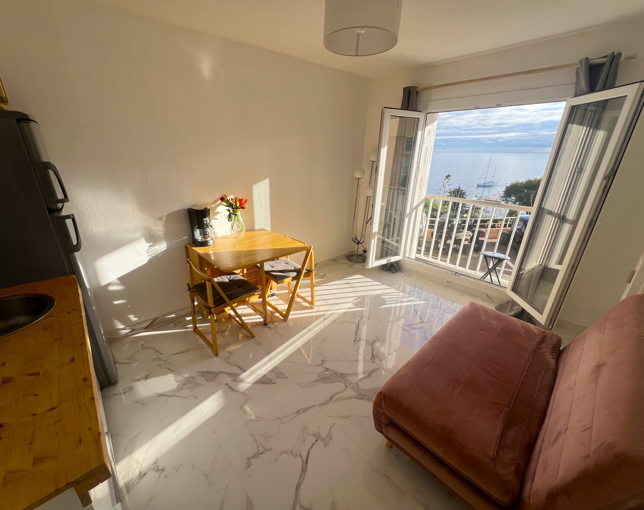 Vue mer et Monaco de salon et balconnet. Calme. A pieds de Monaco(5min.a pieds),plages Marquet (5 min. à pieds),commerces, port de Cap d’ail, bus 100 devant immeuble , train à 5 m, Tennis à 3 min. C’est une 2 pièce de 26 m ²+ petit balcon. Salon, cuisine ouverte équipée, une chambre indépendante avec 2 lits simples/ petite fenêtre , rangements .salle de douche . Plein centre ville. Machine à laver, machine à café, réfrigérateur, micro-ondes, double vitrage.